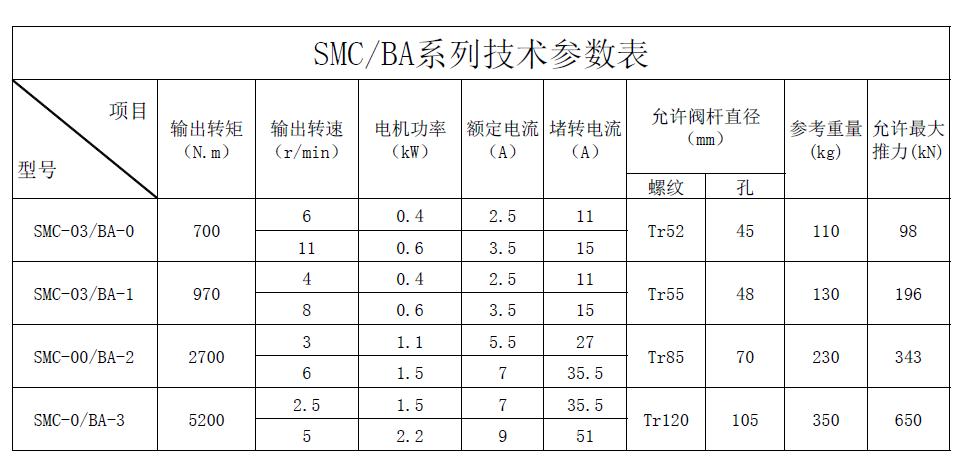 SMC/BA系列電動(dòng)裝置是SMC系列中小轉(zhuǎn)矩多回轉(zhuǎn)電動(dòng)裝置與BA圓錐齒輪減速器的一種組合型式,它適合閘閥、截止閥等多回轉(zhuǎn)閥門(mén)的驅(qū)動(dòng)控制。SMC/BA電動(dòng)裝置具有以下特點(diǎn):以較小轉(zhuǎn)矩規(guī)格的SMC電動(dòng)裝置與BA減速器組合可獲得更大的輸出轉(zhuǎn)矩。在輸出轉(zhuǎn)速允許的條件下,選用該產(chǎn)品能夠提高所選電動(dòng)裝置規(guī)格的通用性,便于產(chǎn)品的使用、維護(hù)。