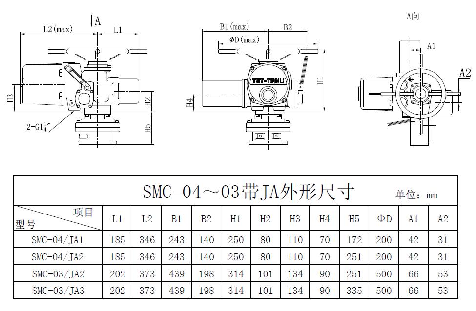 SMC/JA系列閥門電動裝置是部分回轉型閥門電動裝置,適用于球閥、蝶閥等類型閥門以及電動風門。其結構形式為組合式,由SMC多回轉電動裝置與JA部分回轉減速裝置相組合而成。該系列產品所適用的環(huán)境條件、溫度、濕度、海拔、防護等級均能達到SMC相應規(guī)格產品的水平。